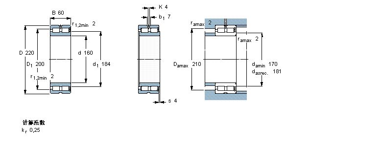 | 圓柱滾子軸承, 雙列滿裝滾子, 無密封件, 單方向軸向負荷的擋邊 | ||||||||||